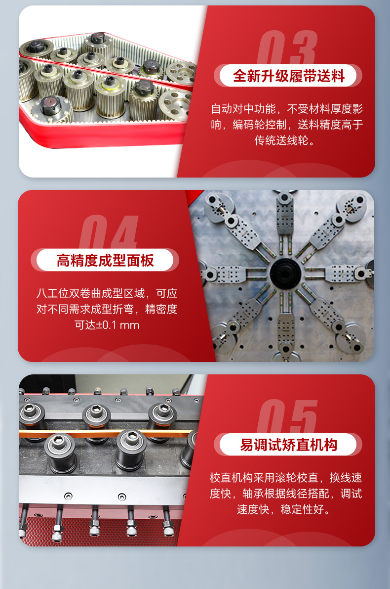 3.履帶送料,具備自動(dòng)對中功能,不受材料厚度影響,直接使用;同時(shí)安裝編碼輪控制,送料精度高于傳統(tǒng)送線輪。